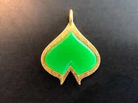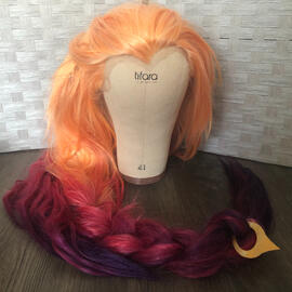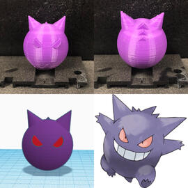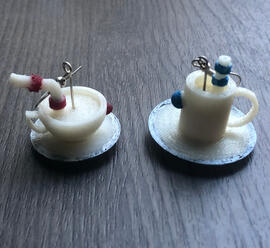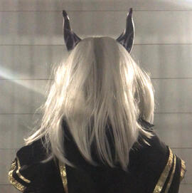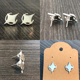 From L to R, top to bottom: (1) Zoe wig and 3D printed jewelry from League of Legends; (2 - 4) horns and silver earrings inspired by a show called The Dragon Prince; (5) Cuphead and Mugman charm earrings from the Cuphead video game; (6) 3D printed design of Gengar for "the 5-minute Pokemon challenge" on social media in 2019; (7 - 8) 3D printed gold-plated steel and resin pendant charm and laser cut symbol, both inspired by The Arcana mobile phone game; (9) 3D printed and laser cut project for an ASU Emerge 2019 exhibit about solving problems from Star Trek; inspired by "The Trouble with Tribbles"